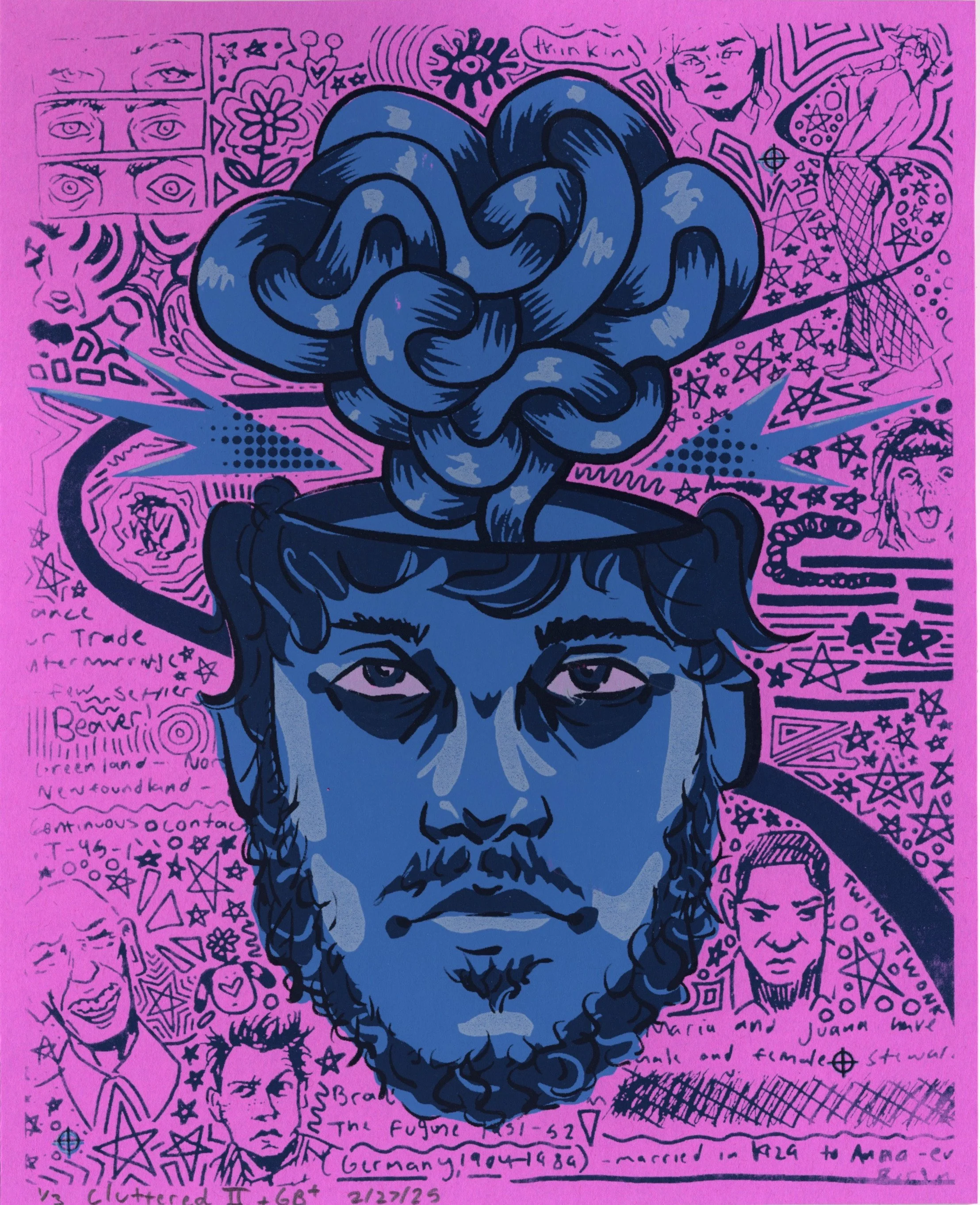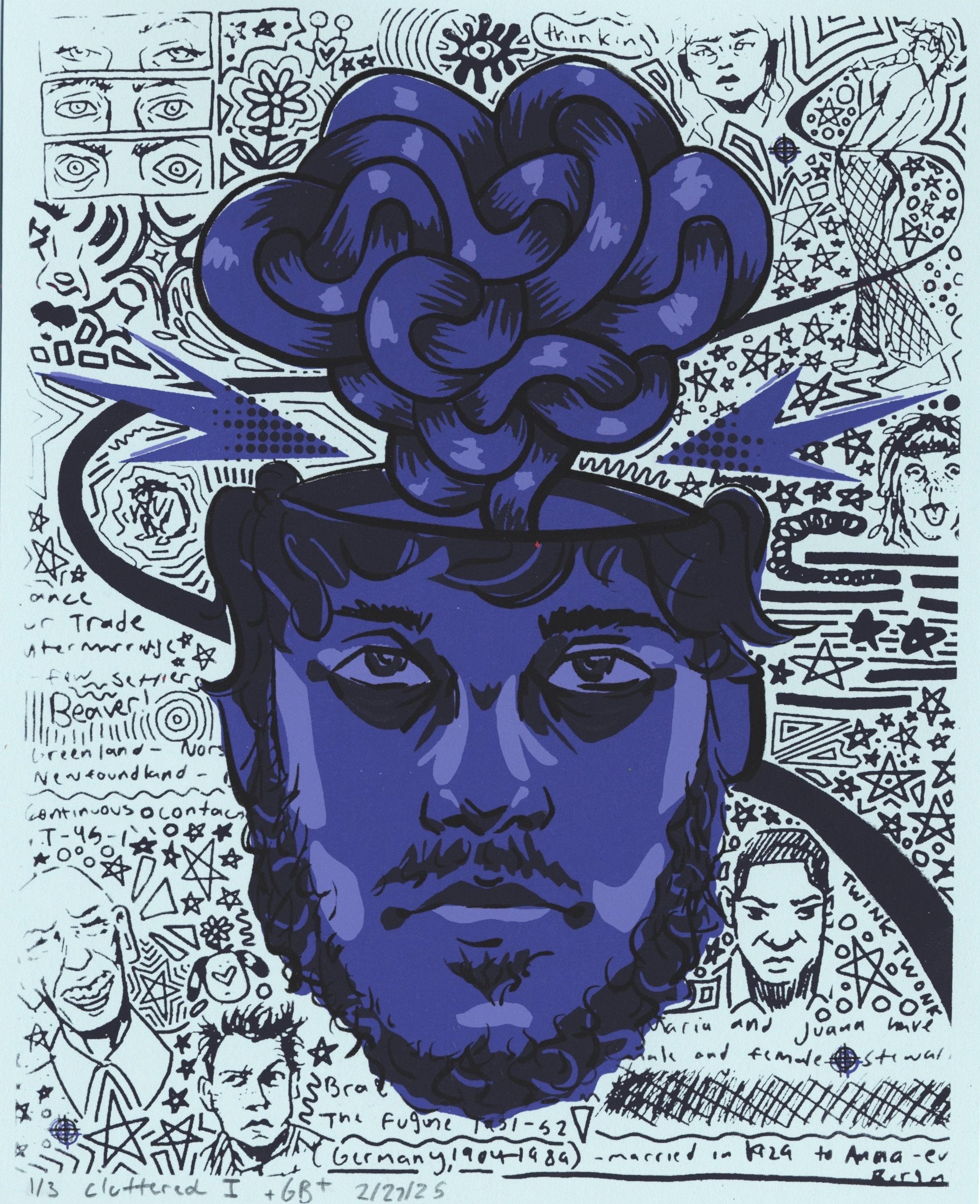 When creating these pieces, I wanted to utilize found media that conveyed the clutter and frustration. These doodles were the perfect edition, representing the scattered and restless mind. The work makes a consistent layer that fills and crowds the figure.
